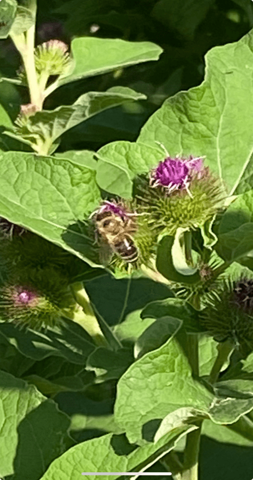 Above: FLORIBUNDA! A bee takes nectar from a patch of burdock in the author’s backyard; hundreds of various bees, insects, butterflies, and birds come and go each day (photo by the author)